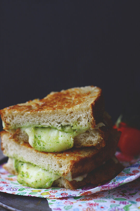 → Sa druge strane namazati feta sir, pesto od sremuša i poređati u debljem sloju izrendani edamer. Preklopiti sa drugim parčetom hleba tako da strana sa puterom bude od gore.