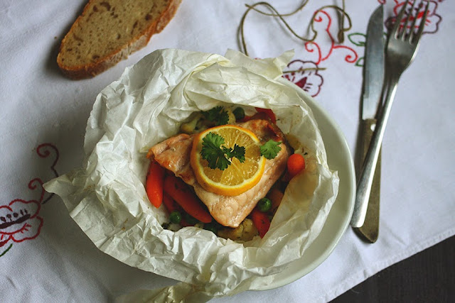 → Iseći 2 kocke kocku od papira za pečenje, na sredinu staviti povrće pa preko losos i limun, i zavezati na vrhu.