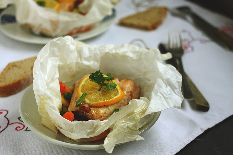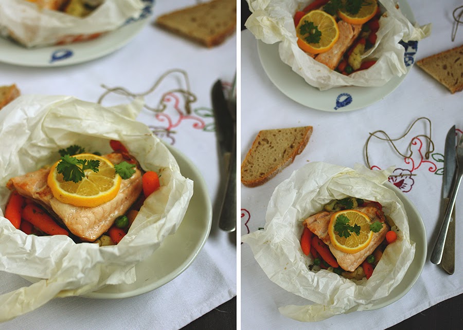 → Iseći 2 kocke kocku od papira za pečenje, na sredinu staviti povrće pa preko losos i limun, i zavezati na vrhu.