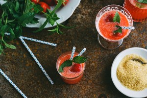 → Dodajte 2 kašike šećera, rendanu koricu i malo izmiksanih jagoda i sameljite sve. Kada je samleveno, procedite od krupnijih komadića i taj sok prebacite u flašu sa jagodama. Dobro promućkajte, dodajte sveže nane i nalijte vodom do vrha.