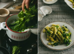 → 2 minuta pre kraja kuvanja paste, ubacite španat.→ Kada je pasta skuvana, procedite sve kroz cediljku.