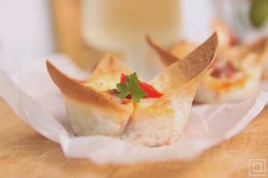 Sipati sos sa povrćem u svaku od korpica i preko posuti narendani trapist. U principu, ovde može ići bilo koji žuti sir, međutim, već godinama ja najviše koristim trapist. Preko sira posuti seckani peršun. Peći 10 minuta u rerni zagrejanoj na 250 stepeni, sve dok se sir ne otopi i dok se vrhovi tortilja ne zapeku.