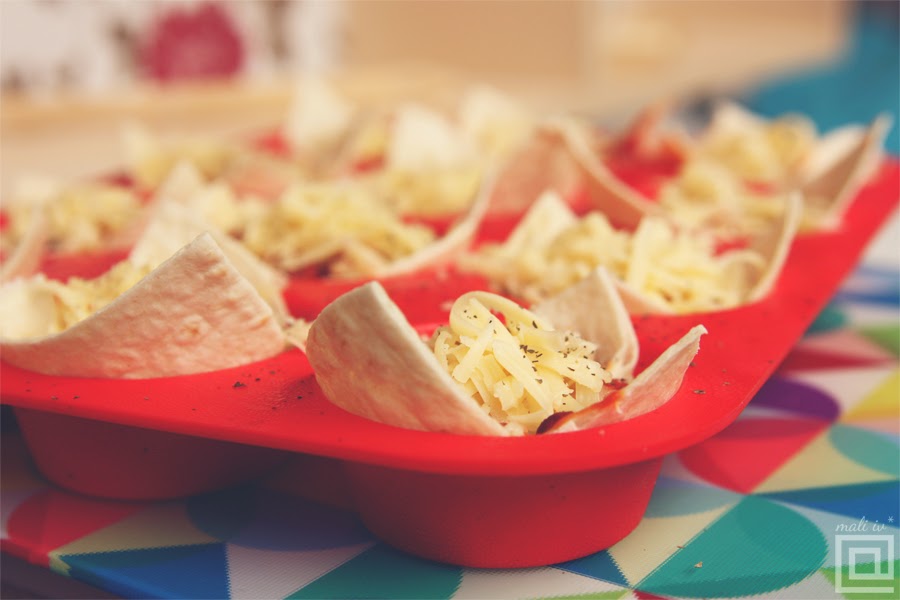 U modle za kapkejs postaviti podlogu. Ja koristim silikonske modle, koje podmažem sa mrvicom ulja (i četkicom). Kao testo u ovoj varijanti, najbolje idu tortilje. Pošto je ovo brz obrok, onda preporučujem kupovne tortilje, do 20 cm prečnika. Iseći jednu tortilju na 4 jednaka dela i svaki deo pažljivo saviti i smestiti u pojedinačnu modlu, tako da krajevi tortilje vire izvan modli.