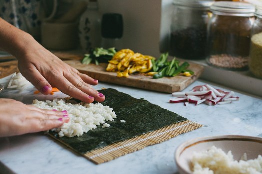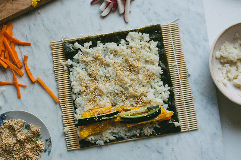 → Na bambusovu podlogu ili na neku drvenu podlogu koja može da se urola, stavite nori algu i mokrim prstima utapkajte u tanjem sloju na nju pirinač. Pospite sa susamom i nafilujte kombinacijom po želji. Pogledajte kako trebate urolati i napraviti maki. Poslužite odmah.