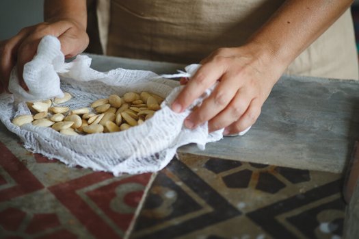 → Properite bademe i dobro ocedite pa skinite kožu. Nakon toga stavite ih u krpu i dobro prebrišite.