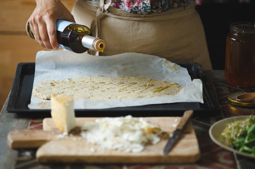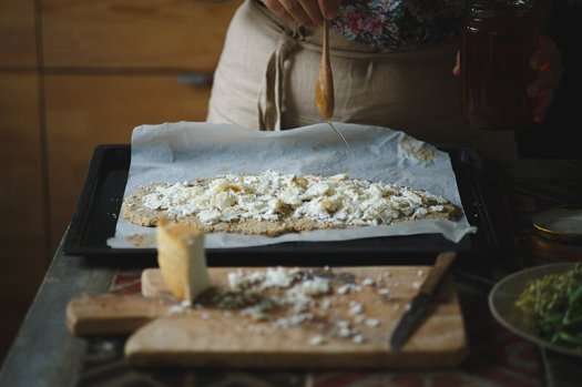 → Nakon tog vremena, izvadite testo i pospite sa malo hladno ceđenog maslinovog ulja. Preko stavite sir i med prelijte kašikom po celoj površini.