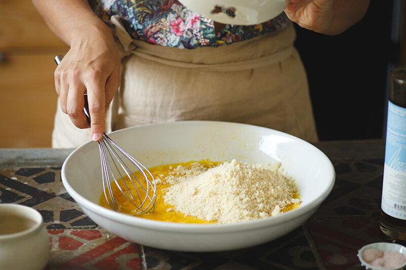 → I činiji izmutite jaja, dodajte so, beli luk i ulje pa dodajte prvo bademovo pa onda heljdino brašno. Sjedinite sve sastojke da dobijete kompaktno testo.→ Na papitu za pečenje razvijte testo debljine 1 cm.→