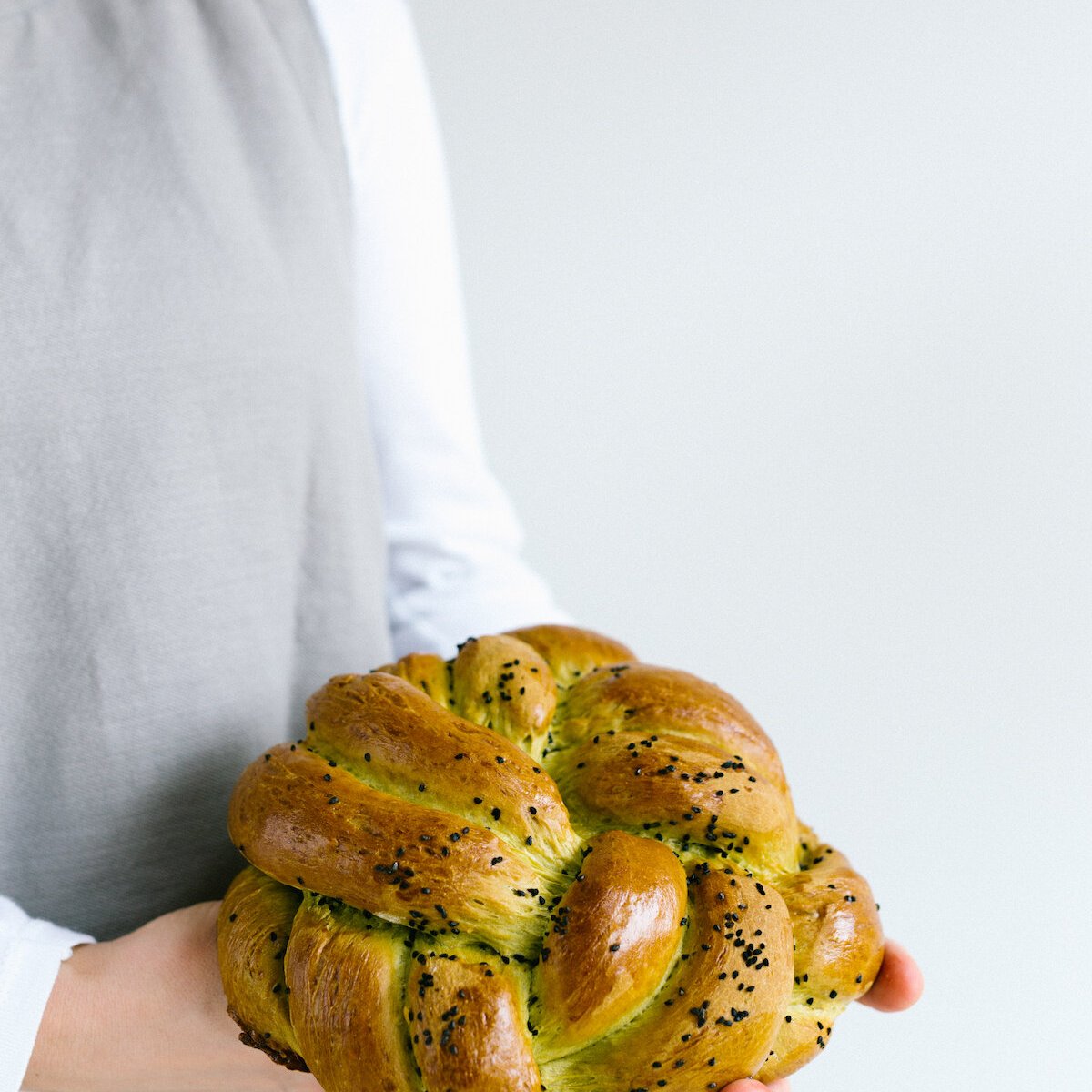 U činiji pomešajte otopljeni maslac, mleko, umućena jaja i 200g brašna, kvasac i matchu. Dodajte šećer i so. Dobro izmešajte. Polako dodavajte ostatak brašna i mešajte. Kada ne budete mogli više da mešate kašikom, izručite na pobrašnjavenju radnu površinu i nastavite da mesite oko 5-6 minuta. Ukoliko je potrebno dodajte još brašna. Testo treba da je meko, elastično ali da se ne lepi za prste. Kada je dobro umešeno, vratite u činiju i prekrijte prozirnom folijom. Ostavite da naraste 1h.Rernu uključite na 200°C.Naraslo testo podelite na 8 jednakih loptica. Loptice razvijte u kobasice dužine oko 12 cm i uvaljajte u susam (nemojte brašnjaviti radnu površinu jer će vam to otežati razvijanje. testo se neće zalepiti.). Pazite da ne rastanjite mnogo kobasice jer vam mogu pući tokom pečenja. Četiri kobasice poređajte vertikalno jednu pored druge a četiri horizontalno preko njih pa upletite (kao gore na horizontalnoj fotografiji). Lagano prekrstite 2 po 2 kraja horizontalnih i vertikalnih kobasica i podvucite pod pogaču.Premažite žumancetom i pospite još malo susama.Šerpu koja je malo veća od pogače namažite puterom sa svih strana i u nju stavite pogaču.Pecite 10 minuta pa smanjite temperaturu na 180°C i pecite još 25 minuta tj dok pogača lepo ne porumeni.