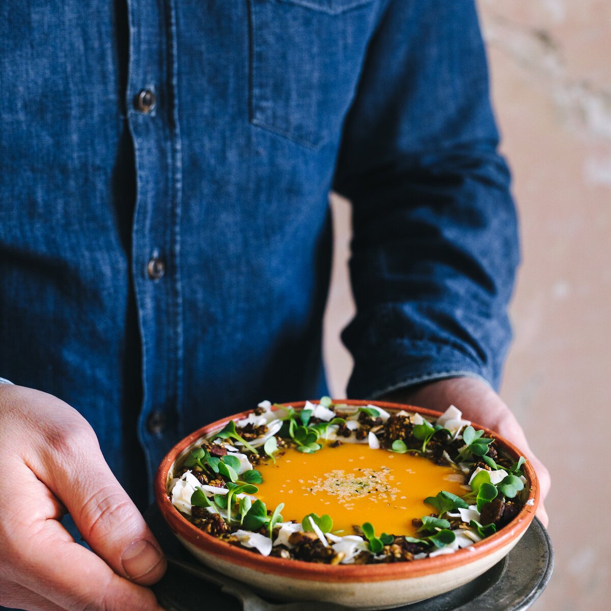 Njihov žuti smoothie, sa mangom, bananom, jabukom, narandžom, limunom i marakujom mi je omiljeni i palo mi je na pamet kako bi bilo super da ga pomešam sa nekim povrćem. Dodala sam slatki krompir i tikvicu! Sjajna kombinacija. Obogatila sam ga granolom bez žitarica, listićima kokosa i izdancima graška. Zvuči ludo ali je mnogo ukusno!