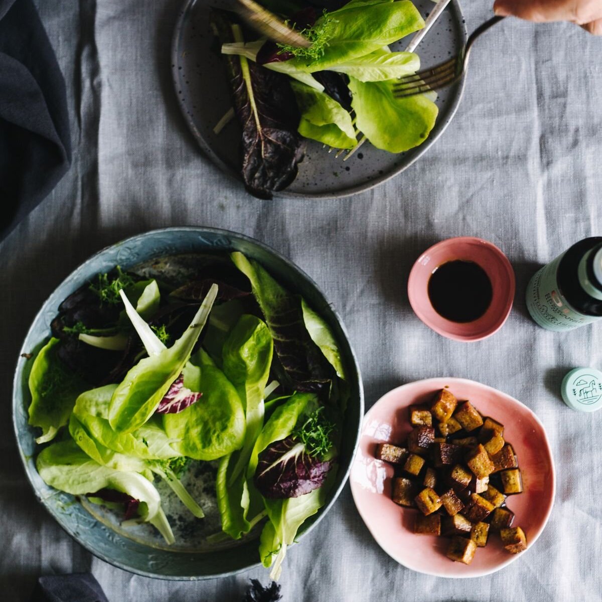 Salatu posolite, dodajte aćeto i tofu i po potrebi dodajte još bunedvinog ulja.